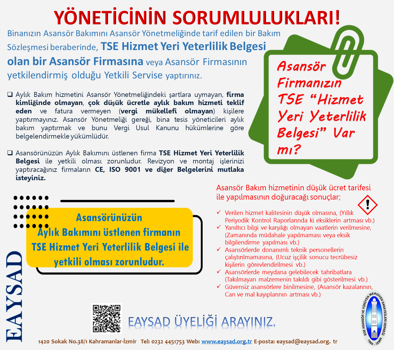 Asansörünüzün aylık bakımını üstlenen firmanın TSE Hizmet Yeri Yeterlilik Belgesi ile yetkili olması zorunludur.